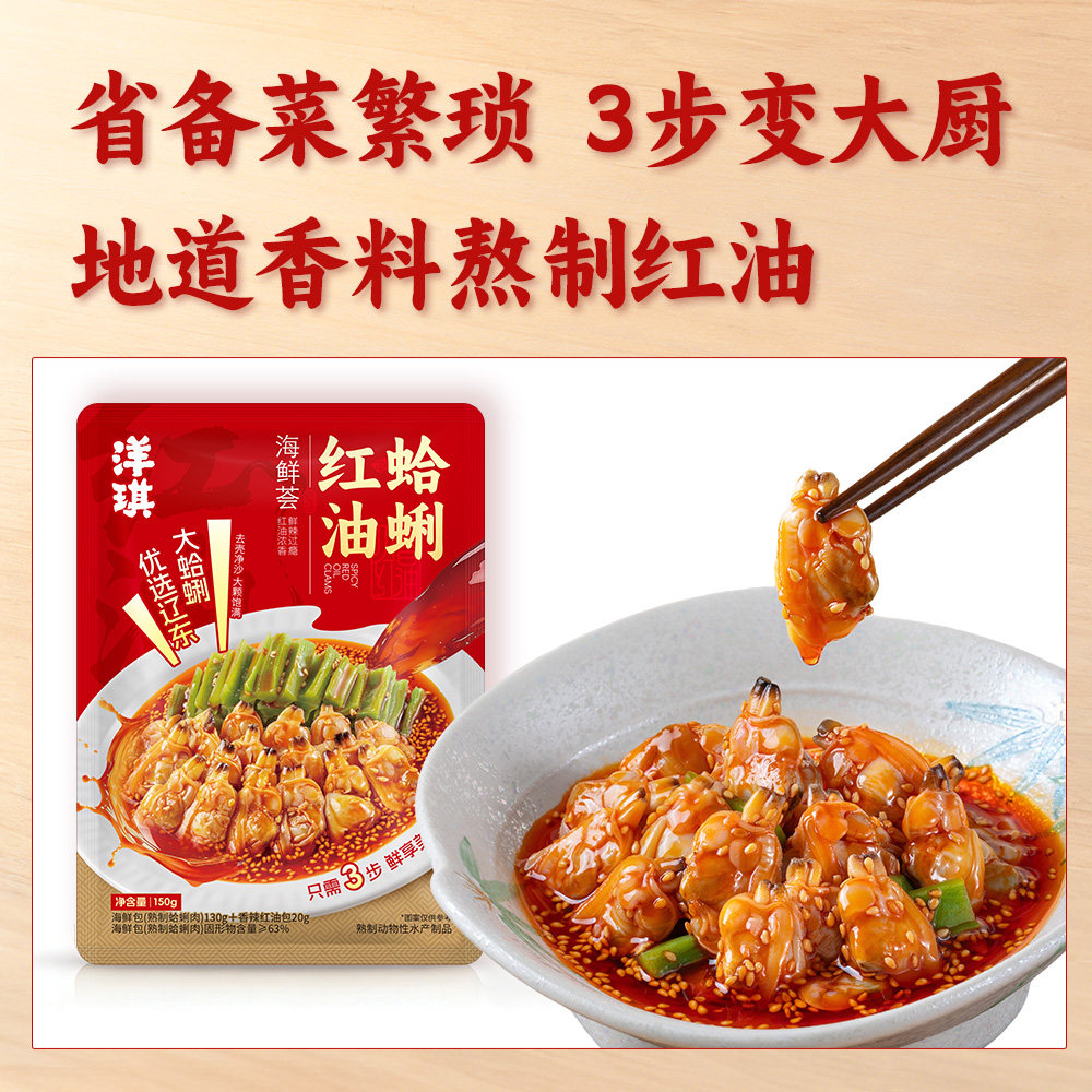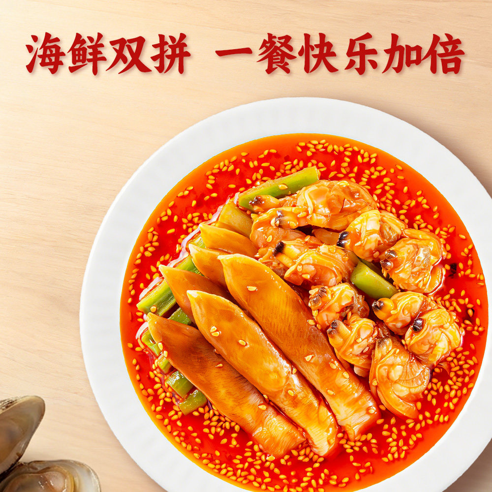 19¥ CZ225 v8o35fTt9Fm¥ https://m.tb.cn/h.imyqtzp [新品]洋琪食品川香红油海鲜双拼竹蛏蛤蜊凤尾虾香辣预制凉菜川菜