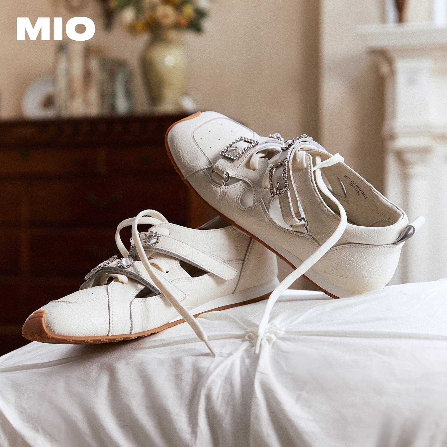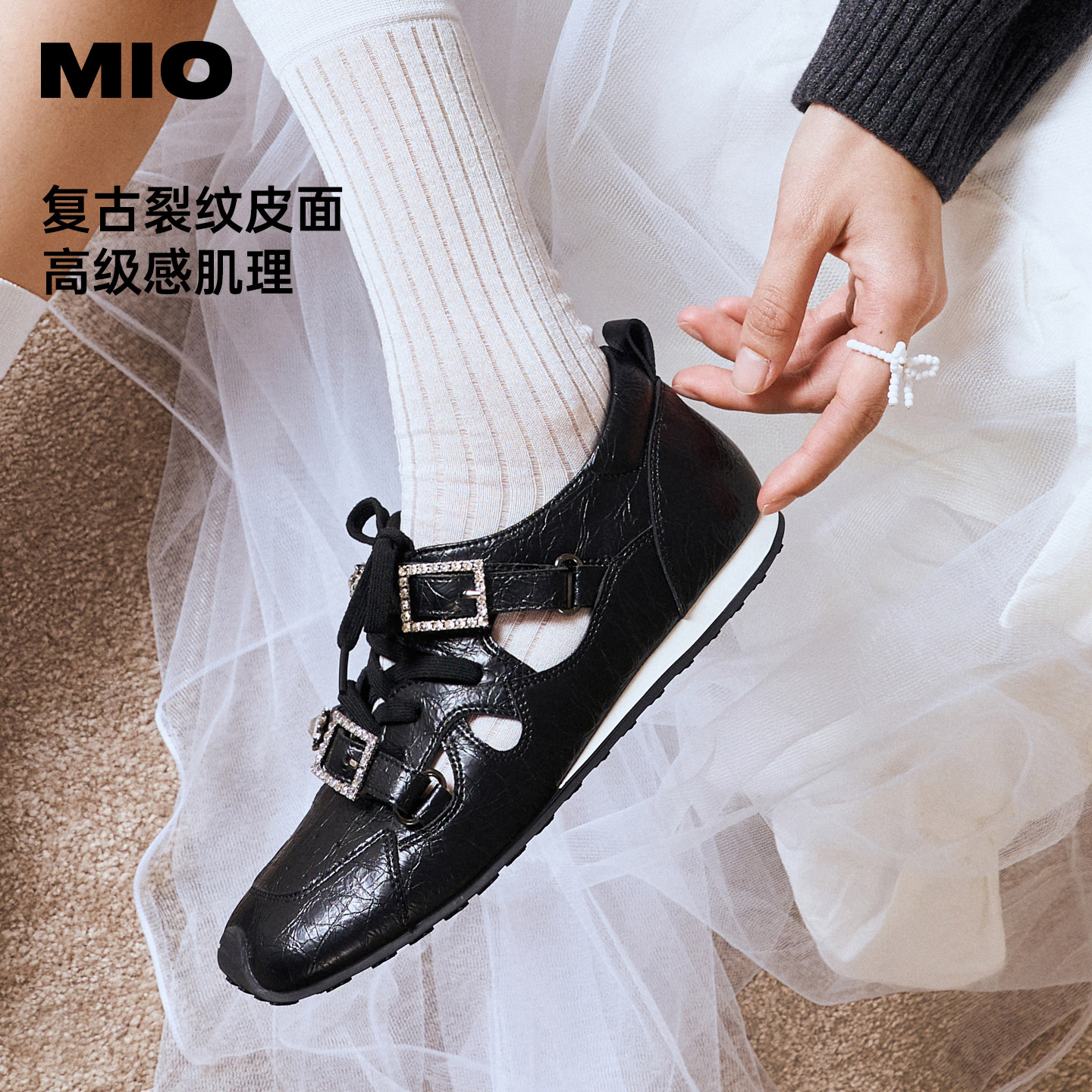 MIO米奥芭蕾运动玛丽珍2026春新款闪钻绑带女阿甘舞鞋裂纹皮单鞋