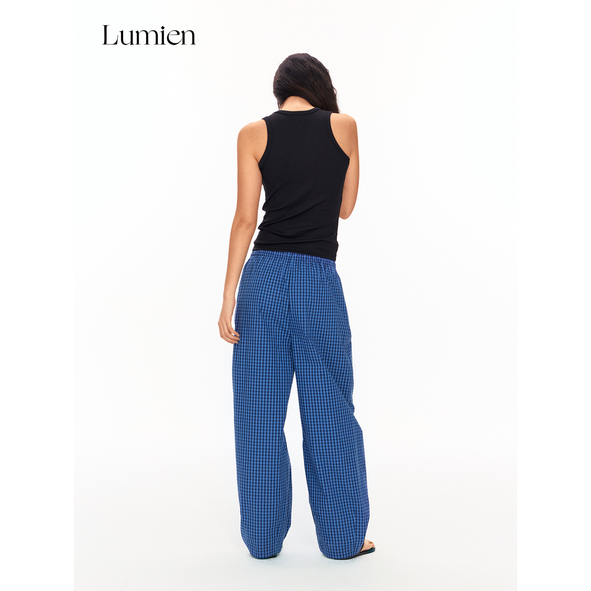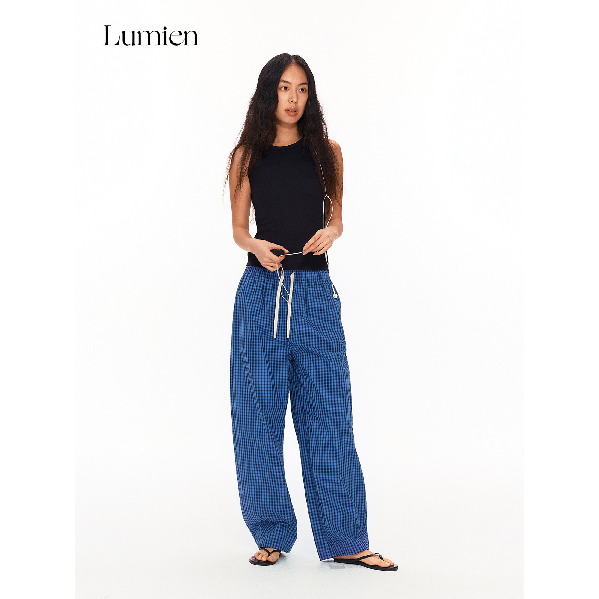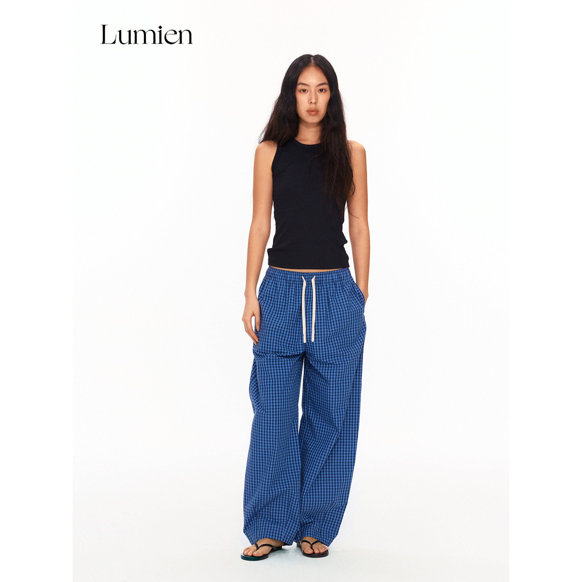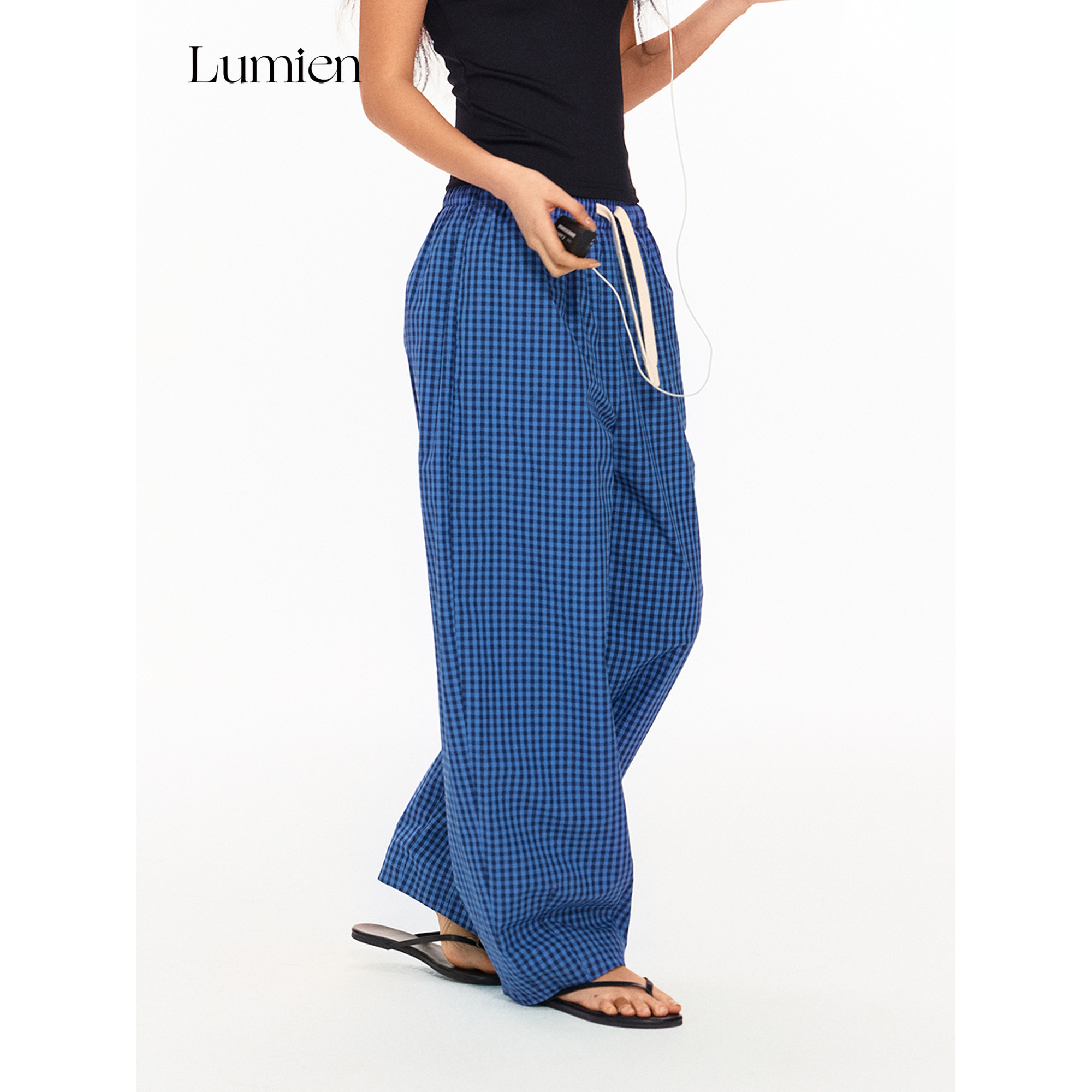 LUMIEN 慵懒风复古蓝格宽松显瘦抽绳休闲裤女春季新款阔腿长裤子