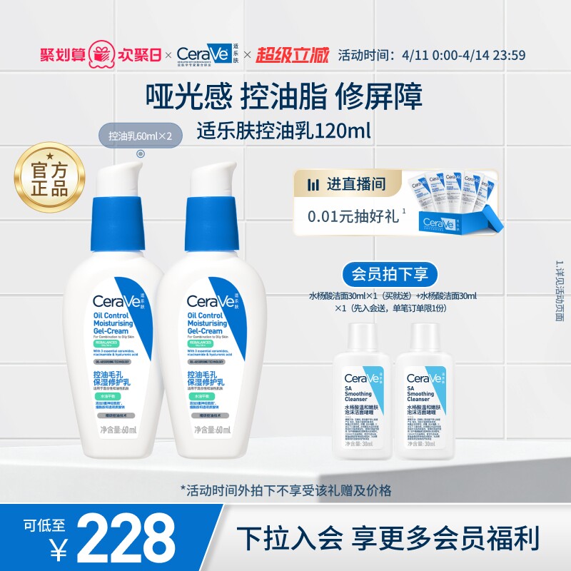 赠:水杨酸洁面30ml(入会) CeraVe适乐肤控油乳60ml主打控油、修护屏障与收缩毛孔三重功效,含三重神经酰胺与水杨酸成分,质地清爽不黏腻,适合油性及混合性肌肤日常使用。 该产品无香精、酒精添加,通过皮肤测试,温和不刺激,既能帮助疏通毛孔减少闭口,又能强化肌肤屏障,避免“越控越干”的尴尬,是油痘肌、脂溢性皮炎人群的理想选择之一。