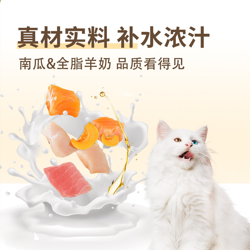 赠运费险【金币约27】专为猫咪夏季设计!鸡肉+南瓜+鳕鱼+羊奶四重补水配方,添加茶多酚汤包,清爽开胃更健康~高含水量湿粮包,软嫩易消化,挑食猫也抢着舔碗~