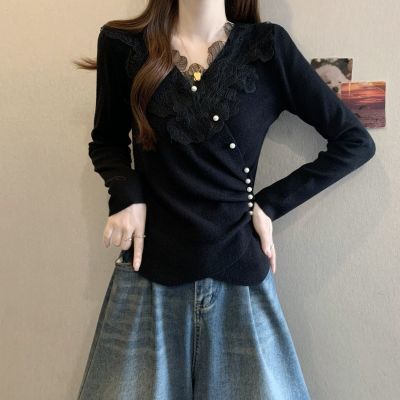 大码德绒设计感不规则蕾丝长袖打底衫女秋冬新款胖mm收腰显瘦上衣