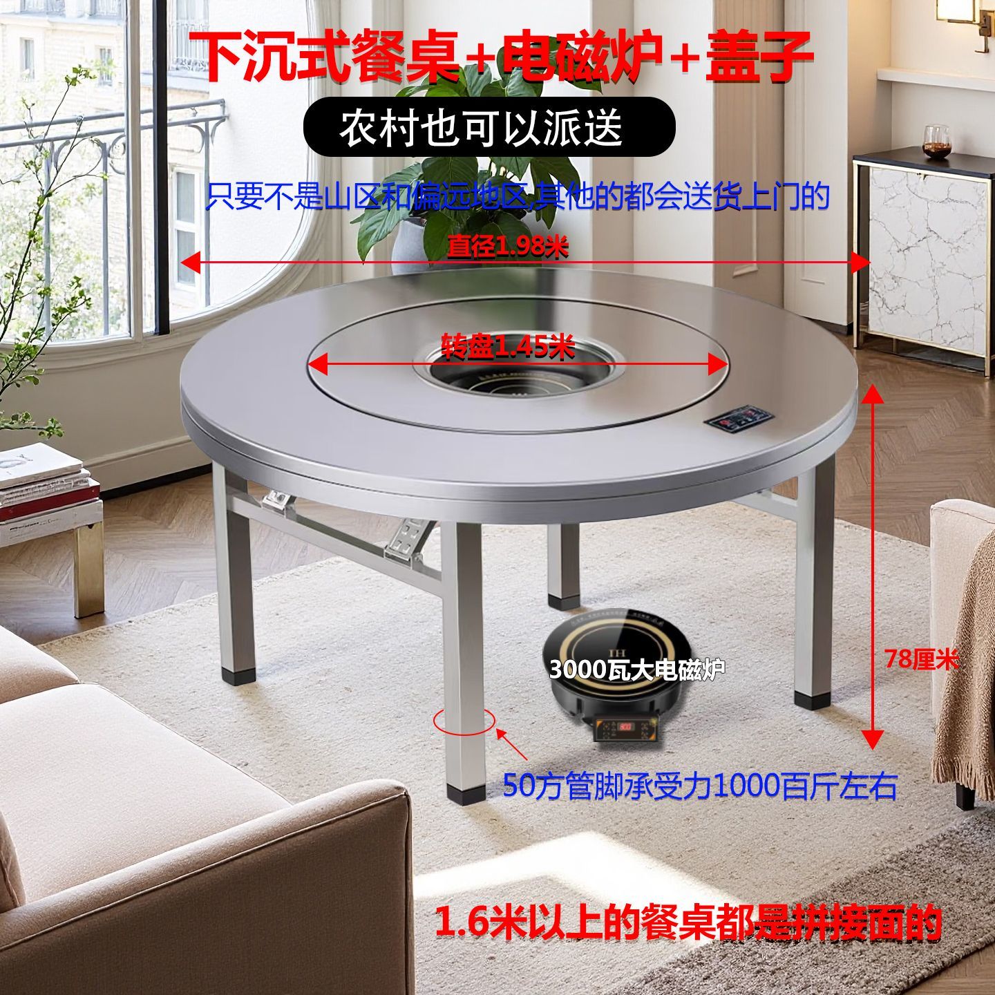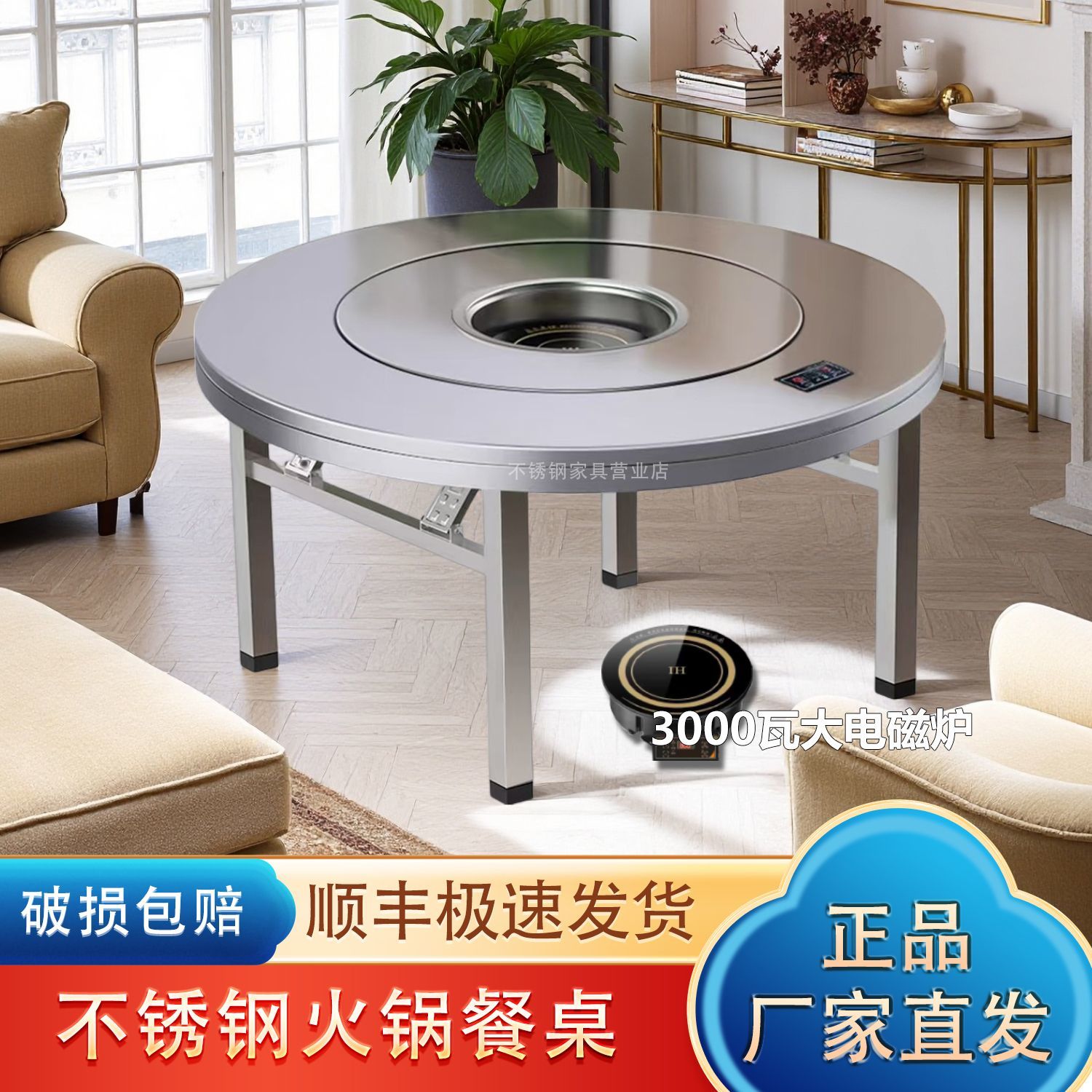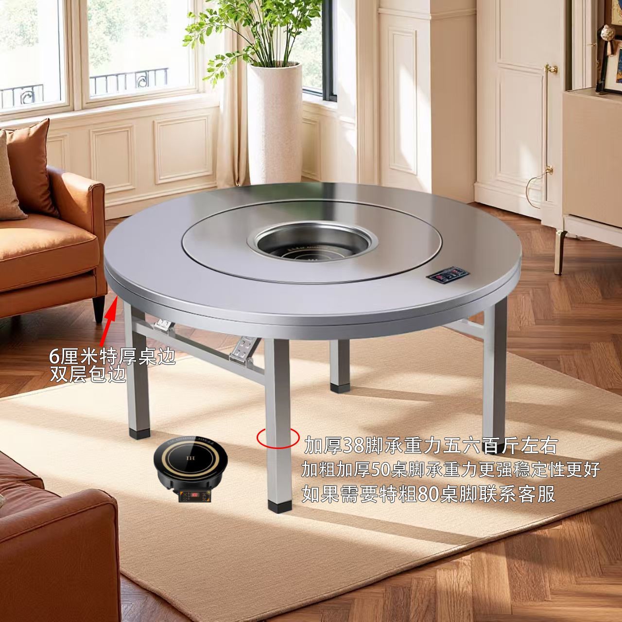 加厚不锈钢餐桌商用多功能桌子家用餐桌一体式电磁炉火锅餐圆桌子