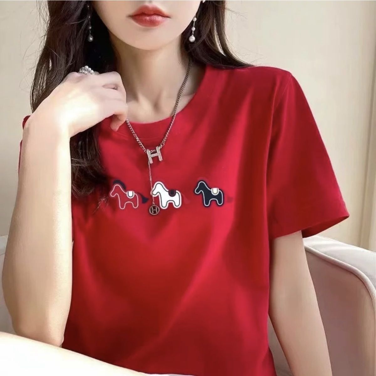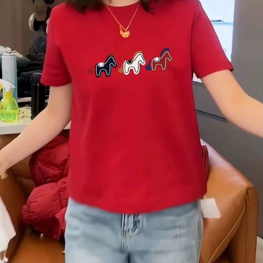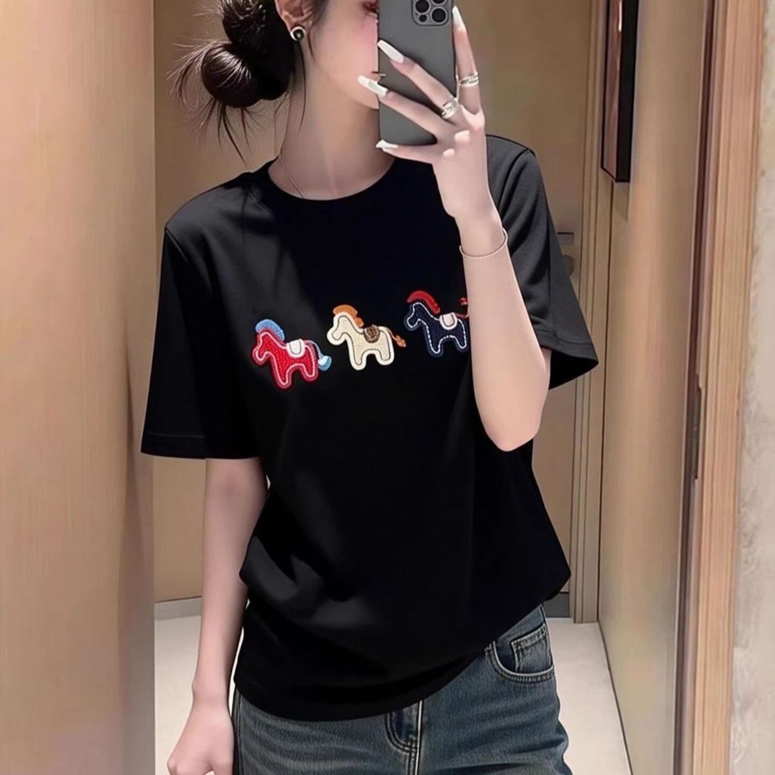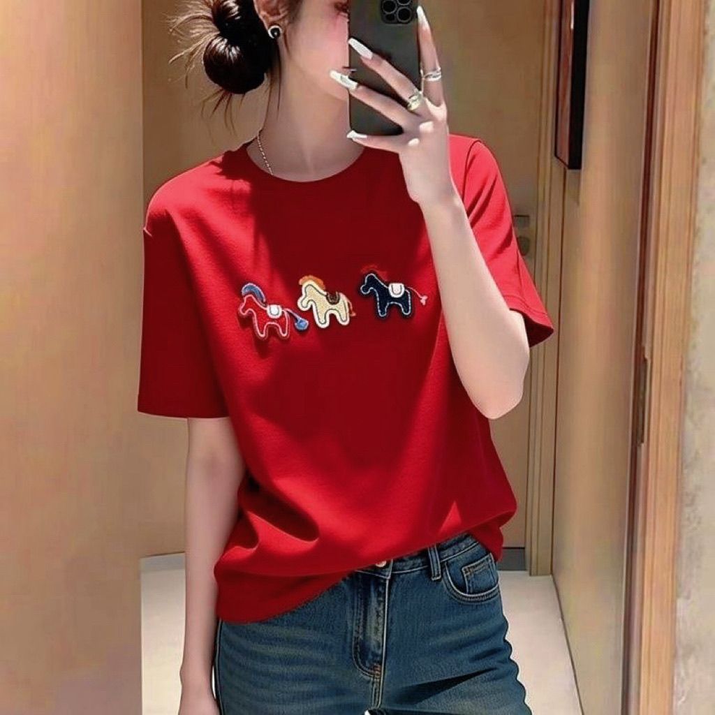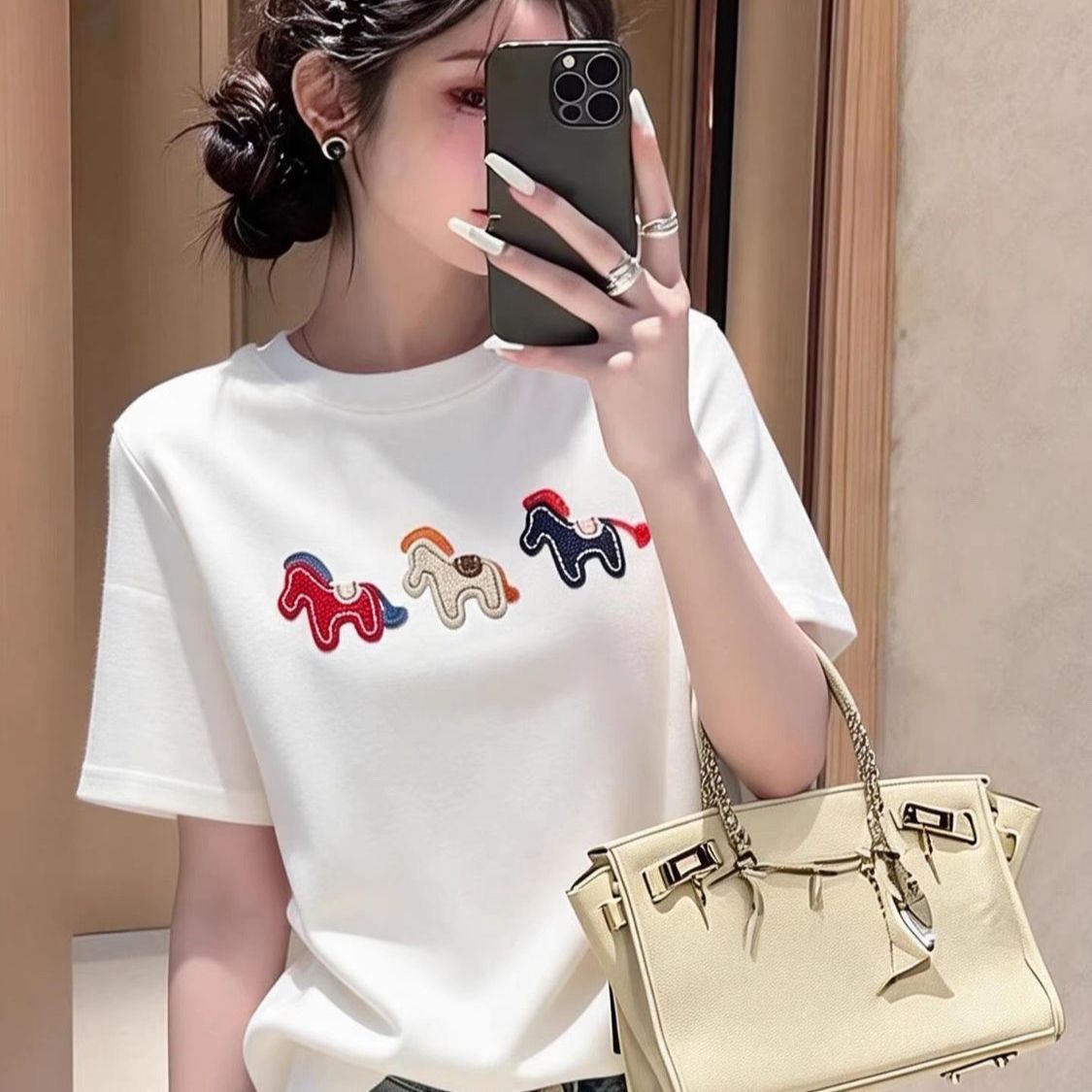 马上有钱正肩纯棉短袖t恤女印花小马2026新款夏季宽松显瘦上衣